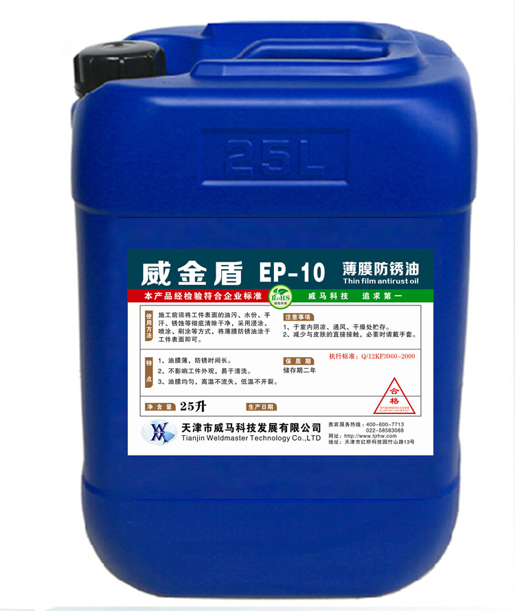 威金盾EP-10薄膜防銹油采用先進防銹技術,具有優良防銹性能,對鋼、鑄鐵、銅具有較長防銹期(一般可達一年半以上),對其他金屬也有較好適應性。
