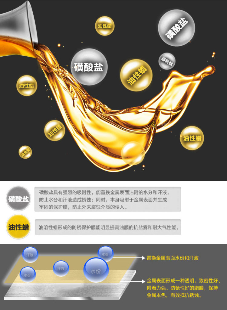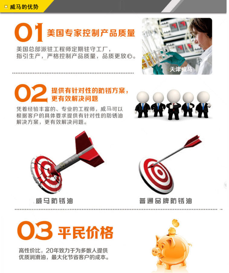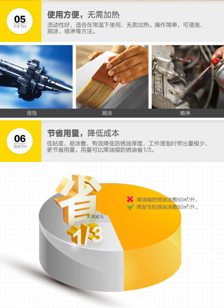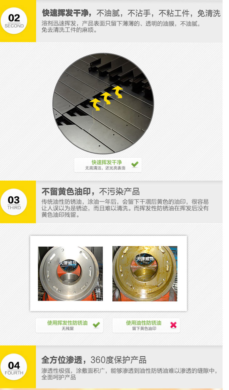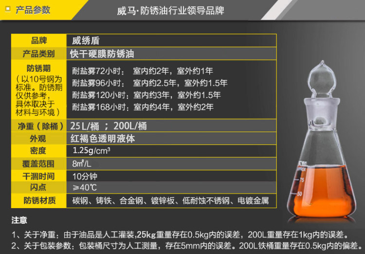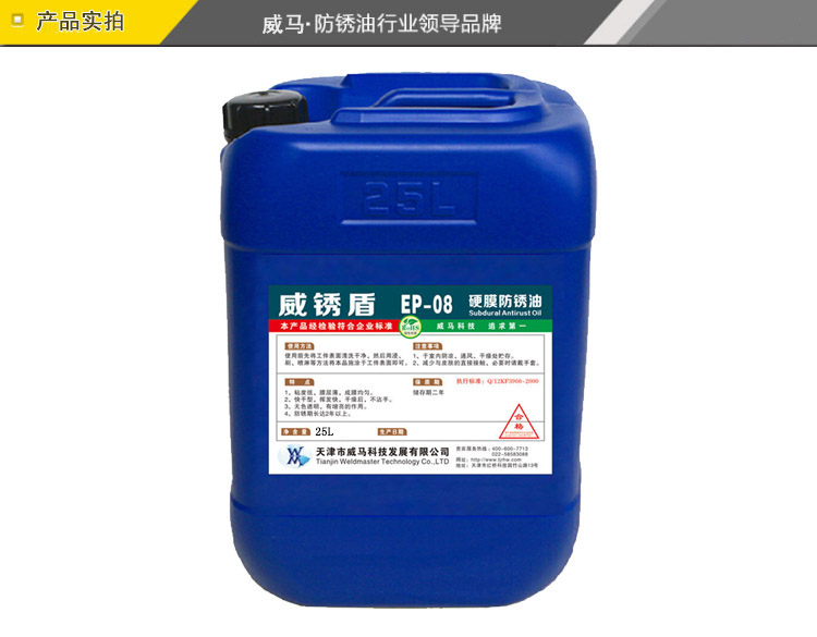 威銹盾EP-08硬膜防銹油是一種無色透明低粘度液體防銹專用品,以樹脂為成膜材料,加入高分子防銹添加劑并用精致石油溶劑配成的防銹油。本品在金屬表面成膜迅速、油膜堅固、透明而均勻,決不沾手,有良好的耐磨耐熱性能,防銹時間持久。可在各種環境下長期保存不銹蝕。本品使用簡便,設備簡單,刷、浸、噴均可,不遮蓋器件原色,并有增光作用。EP-08硬膜防銹油為本公司的招牌產品,公司引進國外先進專利配方和生產工藝,研制開發出的新一代硬膜防銹油。經測試,可以替代進口同類產品,歡迎測試,選購。